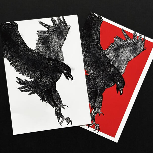 I create monochrome illustrations revolving around nature, my heritage and more obscure, macabre subjects. I sell these on; various sized prints, greeting cards, stickers and wooden pins. The only outsourced product that I sell are wooden pins; they are produced in the UK.